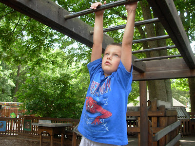 The kids have been in the pool for hours each day. Cooper changes his clothes about three times a day, and not once has he put on his shorts or underwear facing front. They are ALWAYS backwards (see swimsuit). That's Garrett under water.